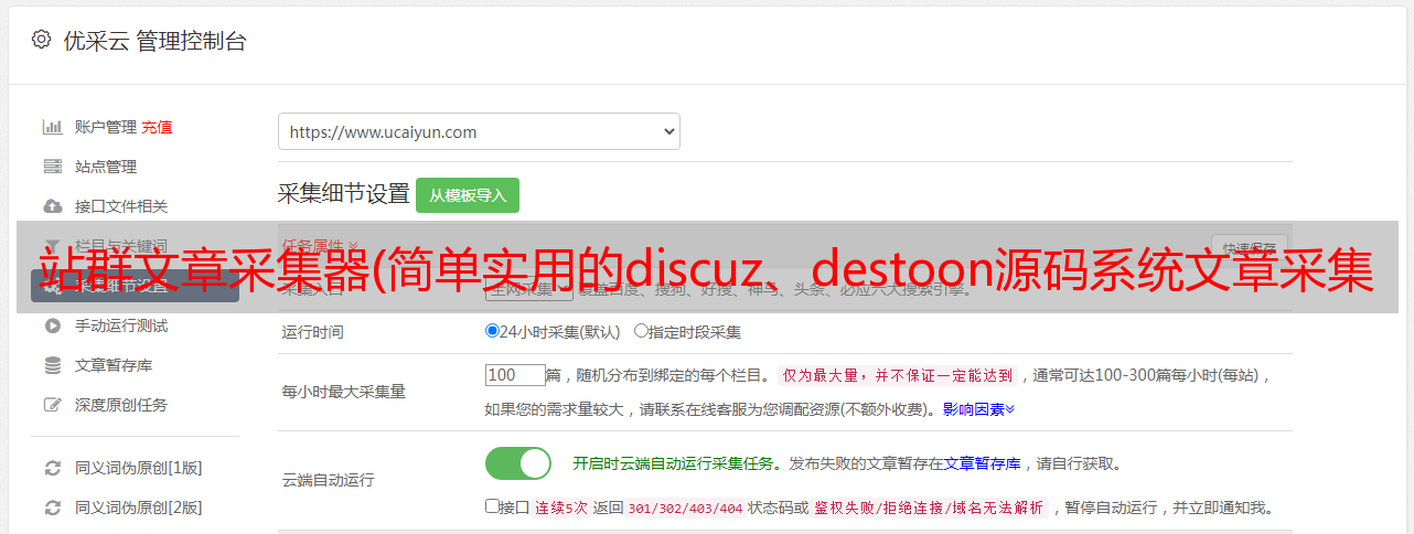 优采云 发布时间: 2021-08-31 04:02站群文章采集器(简单实用的discuz、destoon源码系统文章采集工具的使用方法
