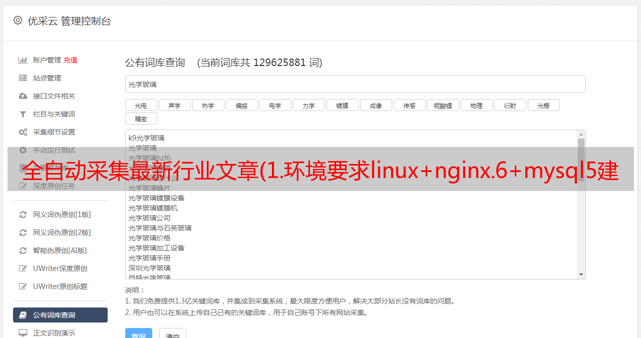 优采云 发布时间: 2021-08-31 07:06全自动采集最新行业文章(1.环境要求linux+nginx.6+mysql5建议安装宝塔linux系统)