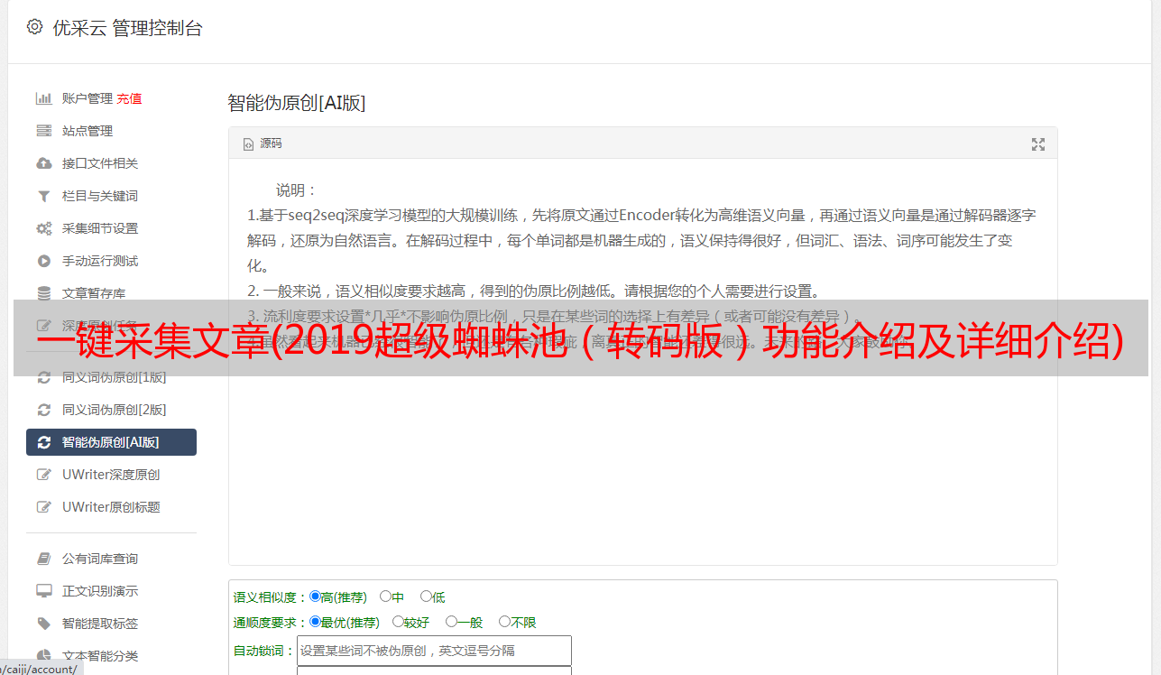 优采云 发布时间: 2021-08-31 17:01一键采集文章(2019超级蜘蛛池(转码版)功能介绍及详细介绍)