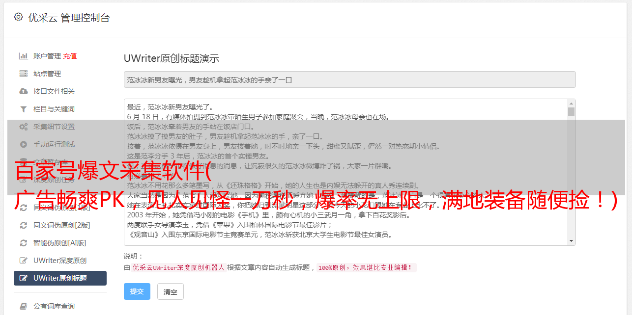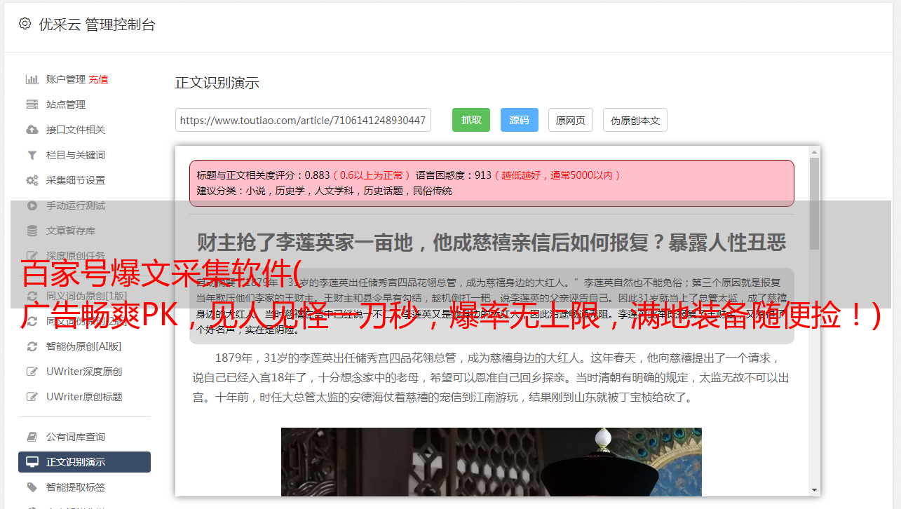 优采云 是为 seo 行业开发的软文 写作工具。 优采云是一个强大的文章伪原创工具,结合了文章采集器和文章@的功能,原创degree检测等功能非常强大。其具体功能如下: