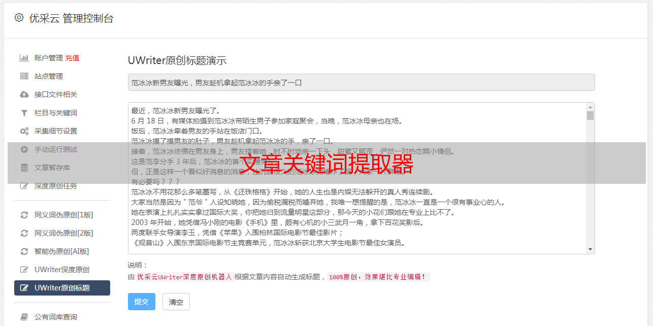 优采云 发布时间: 2020-08-17 11:18文章关键词提取器