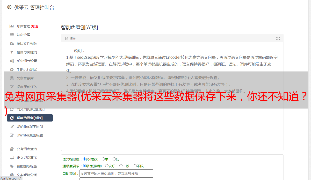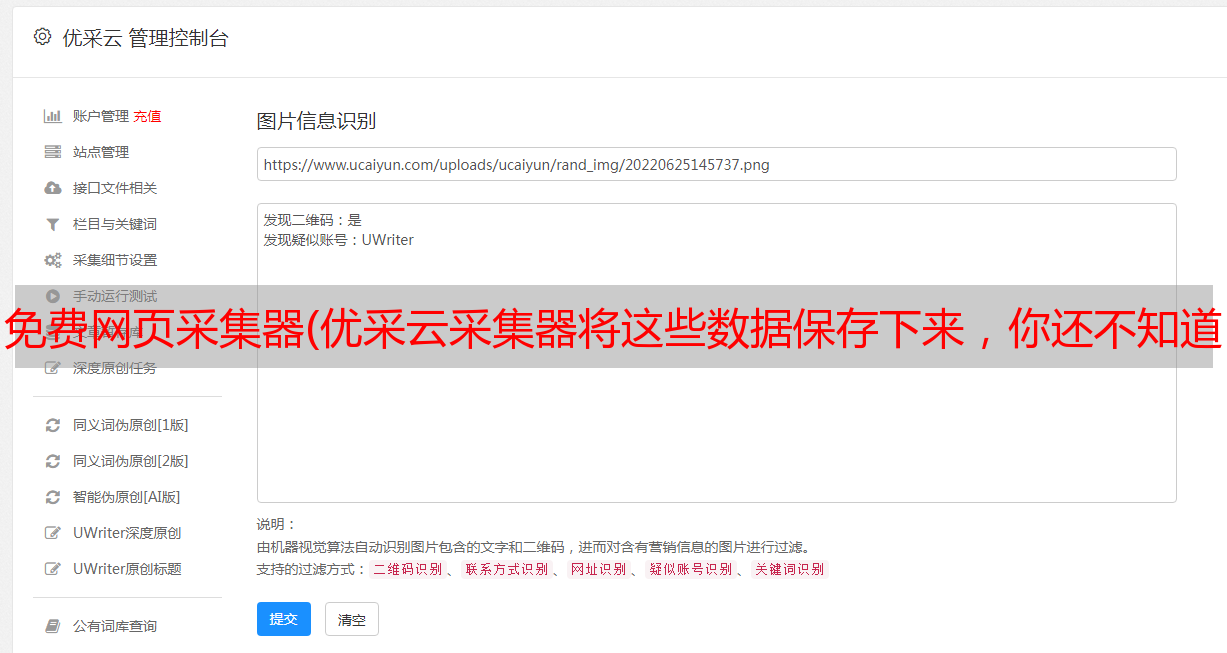 优采云采集器 是一个非常有用的网络信息工具采集。该软件内置浏览器,可以直观地帮助用户采集各种网页内容。操作简单,无需掌握。任何专业的网络知识都可以轻松创建采集 任务,只需单击鼠标即可。 优采云采集器可以自定义采集你需要的网页上的所有信息,并且可以自动识别网页列表、采集字段和分页等,输入采集网址,点击鼠标轻松选择所需的抓取内容; 优采云采集器视化采集器、采集就像积木一样,功能模块可以随意组合,可视化提取或操作网页元素,自动登录、自动发布、验证码自动识别通用浏览器,您可以快速创建自动化脚本,甚至生成独立的应用程序;用户可以使用优采云采集器到采集网页上的一些数据内容,并且这些数据内容可以单独保存,以便用户在浏览网页时如果需要采集资料,可以保存数据并通过这个采集器 使用它。有兴趣的快来下载体验吧!