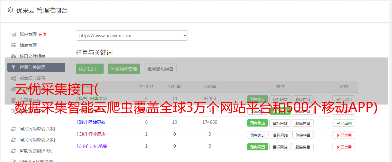 云优采集接口( 数据采集智能云爬虫覆盖全球3万个网站平台和500个移动APP)