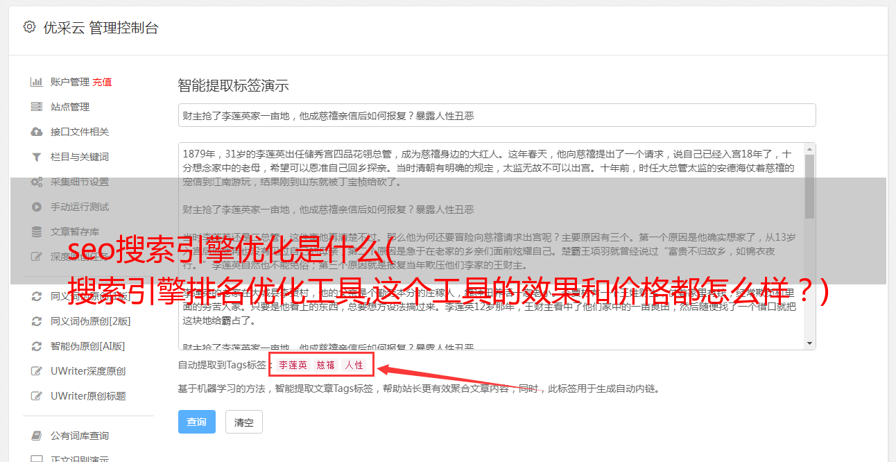 使用SEO优化软件主要是提高你的网站百度和谷歌优化排名,快速帮你提升销售业绩。效果不错,我在用,你可以用