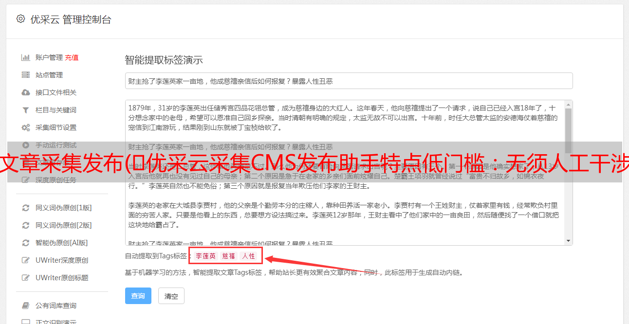 优采云采集cmsauxiliary 是一站式的网站文章采集、原创,发布工具,快速提升网站收录,排名,权重,是网站Content 维护是最好的伴侣。