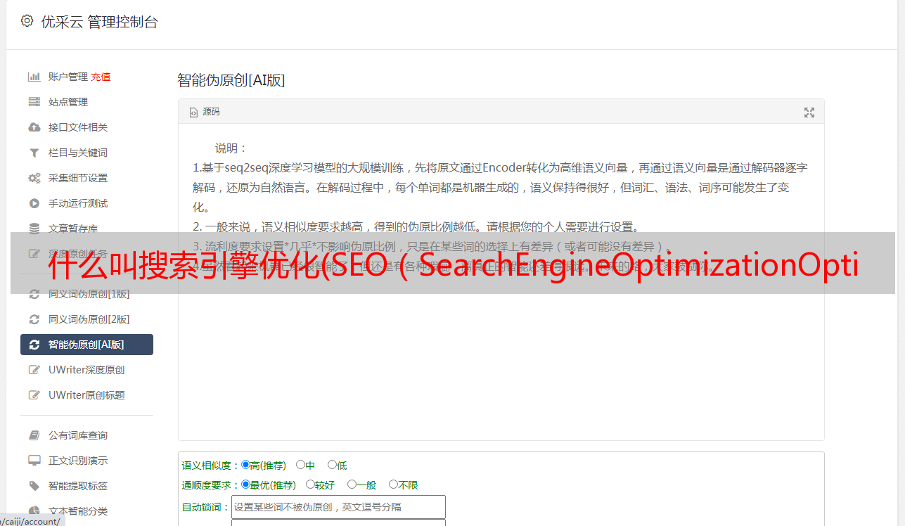 优采云 发布时间: 2021-09-03 20:07什么叫搜索引擎优化(SEO(SearchEngineOptimizationOptimization):汉译为搜索引擎优化。)