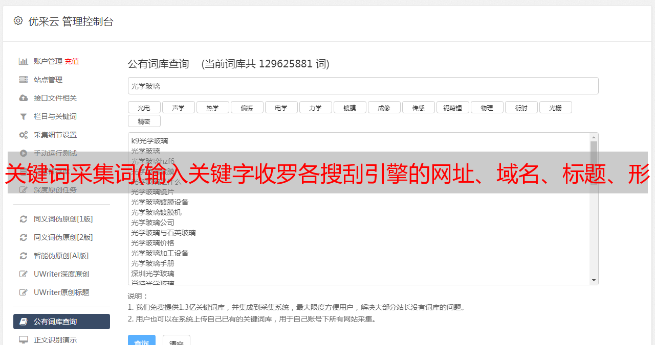 优采云 发布时间: 2021-09-04 19:26关键词采集词(输入关键字收罗各搜刮引擎的网址、域名、标题、形貌等信息支持