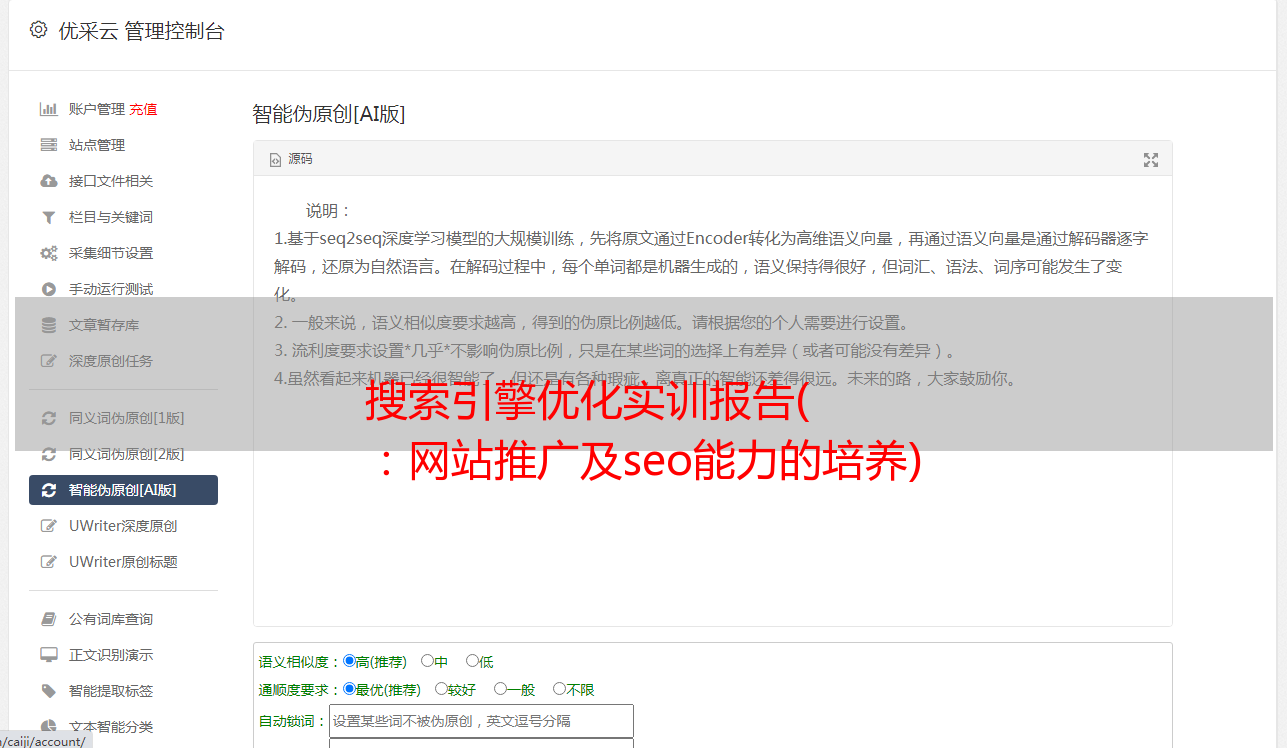 优采云 发布时间: 2021-09-05 05:09搜索引擎优化实训报告(