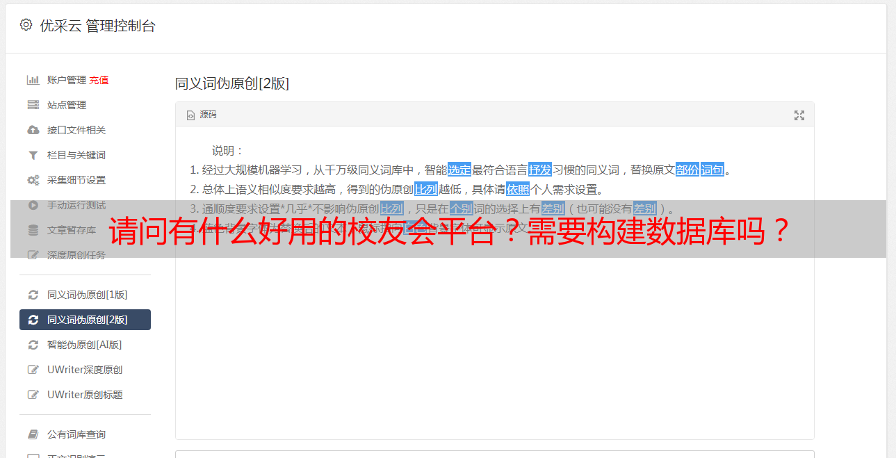优采云 发布时间: 2020-08-20 00:59请问有什么好用的校友会平台?需要构建数据库吗?