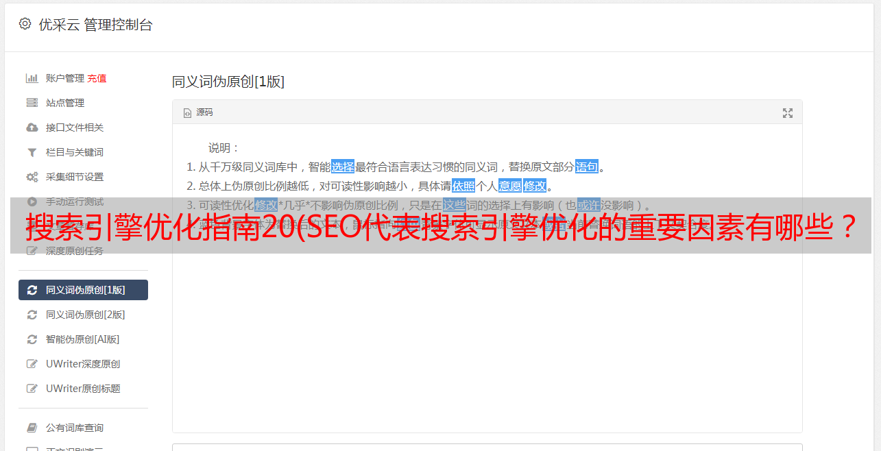 优采云 发布时间: 2021-09-07 09:27搜索引擎优化指南20(SEO代表搜索引擎优化的重要因素有哪些?的CMS)