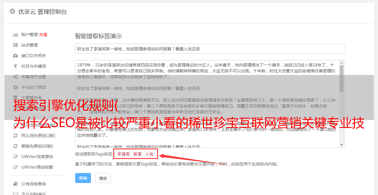 想要SEO等专业技能得到必要的呵护,除了时刻关心账号的升级,更重要的是掌握一套基于半透明肉制品的网络营销系统软件。