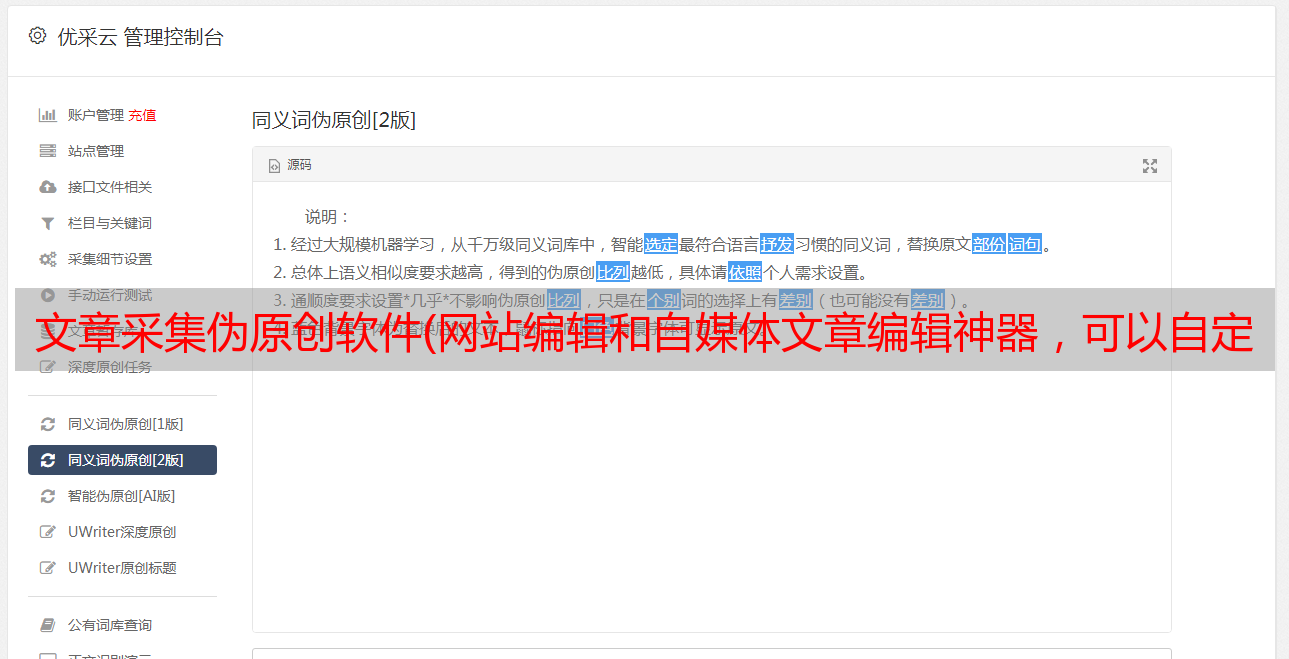 优采云 发布时间: 2021-09-08 22:16文章采集伪原创软件(网站编辑和自媒体文章编辑神器,可以自定义伪原创)