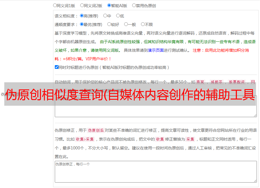 伪原创工具主要用于将复制的文章替换为同义词,调整句子段落的顺序等,达到降低文章相似度的目的。 伪原创工具再好,也不是万能的。 伪原创后需要手动检查句子是否流畅,是否影响阅读。对于追求高质量和原创degree的作者,不推荐使用此工具。只能在工作忙没时间写原创文章时个发帖文章维持账号活跃的时候使用。