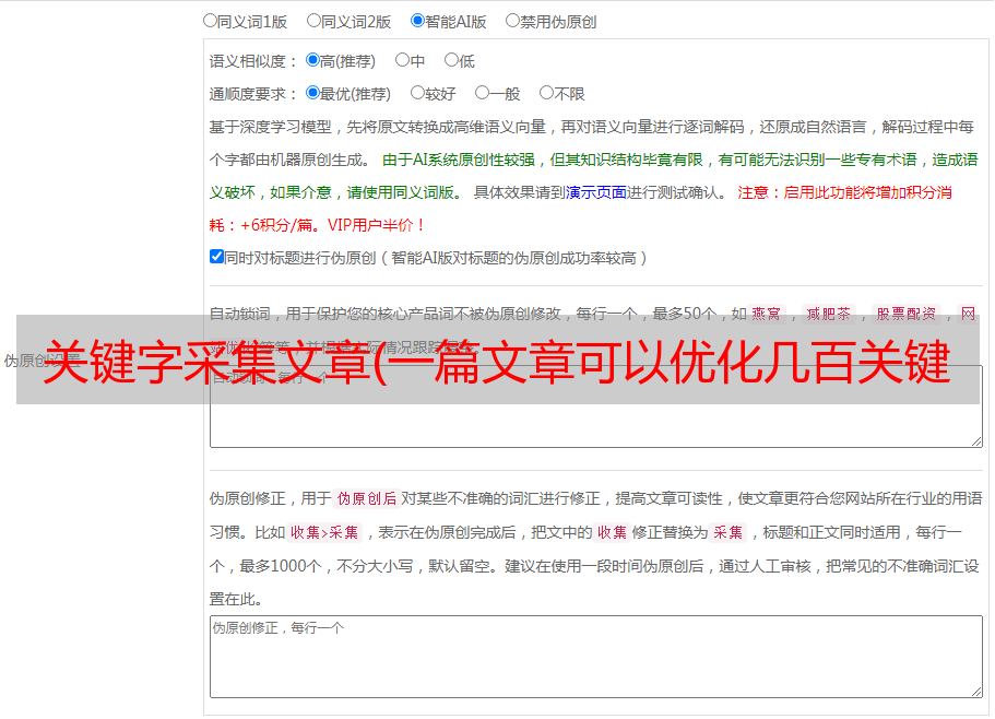 几百关键词的原创优化很简单,就是让文章中的关键词密度非常高,高到只要修改这个关键词就可以了直接影响文章的相似度,由此产生的文章也与原创相似。
