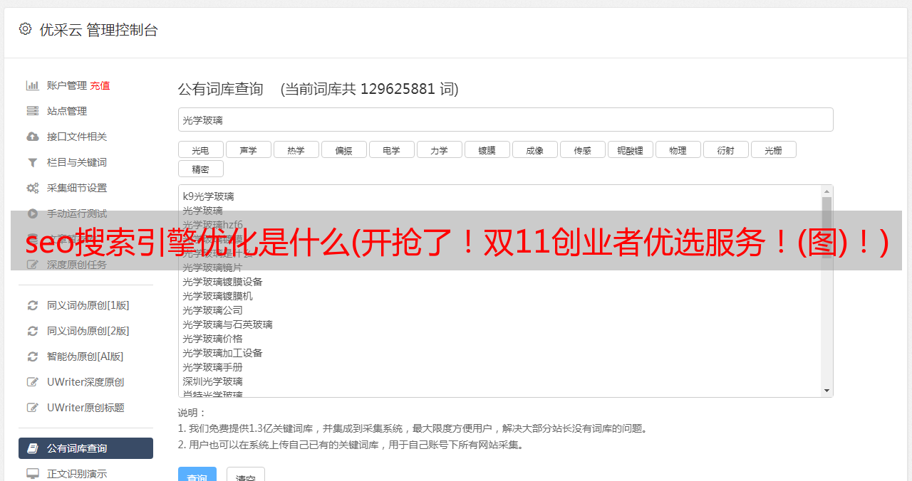 优采云 发布时间: 2021-09-09 21:01seo搜索引擎优化是什么(开抢了!双11创业者优选服务!(图)!)
