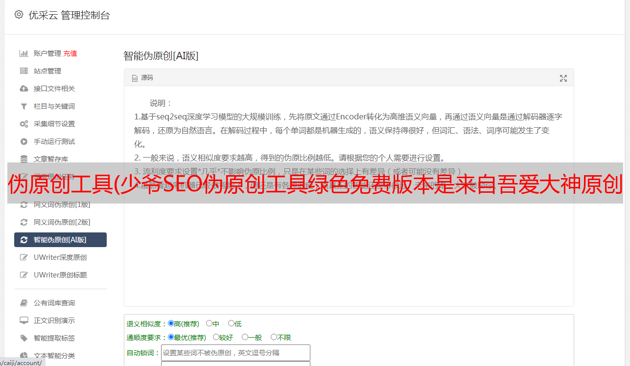 优采云 发布时间: 2021-09-10 15:10伪原创工具(少爷SEO伪原创工具绿色免费版本是来自吾爱大神原创制作的