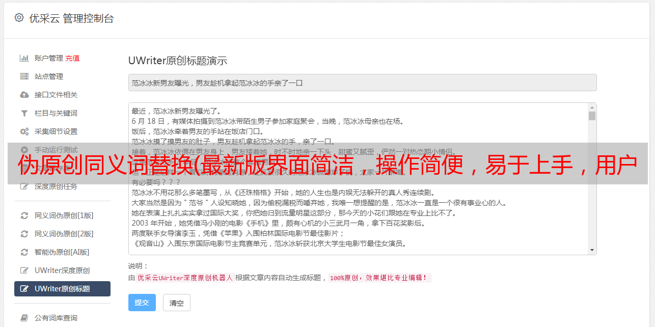 优采云 发布时间: 2021-09-10 20:06伪原创同义词替换(最新版界面简洁,操作简便,易于上手,用户可以放心使用)