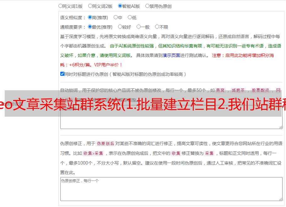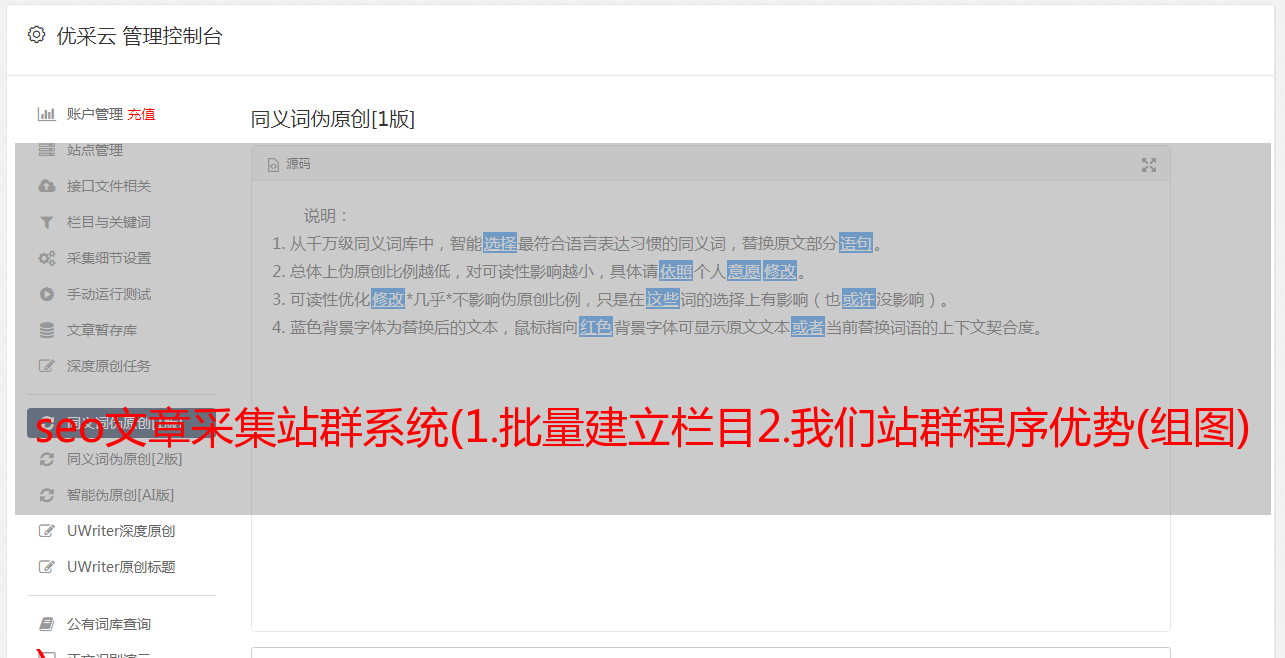 自动标题、段落重排、高级混淆、自动内链、内容过滤、URL过滤、同义词替换、插入seo词、关键词adding链接等方法对采集回的文章processing处理,增强采集文章原创性能,有利于搜索引擎优化,提高搜索引擎收录、网站权重和关键词排名
