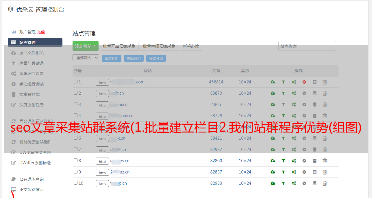 优采云 发布时间: 2021-09-11 05:00seo文章采集站群系统(1.批量建立栏目2.我们站群程序优势(组图)