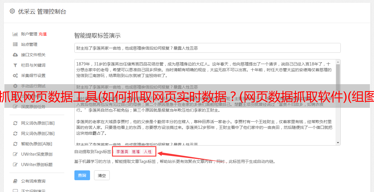 优采云(网页数据抓取软件)是一款非常实用的在线网页数据抓取助手。如何捕获网页的实时数据? 优采云(网页数据抓取软件)为用户快速抓取。他可以帮助用户批量采集网站的页面数据。这个过程是全自动的,非常智能,帮助用户快速采集他们想要的信息。