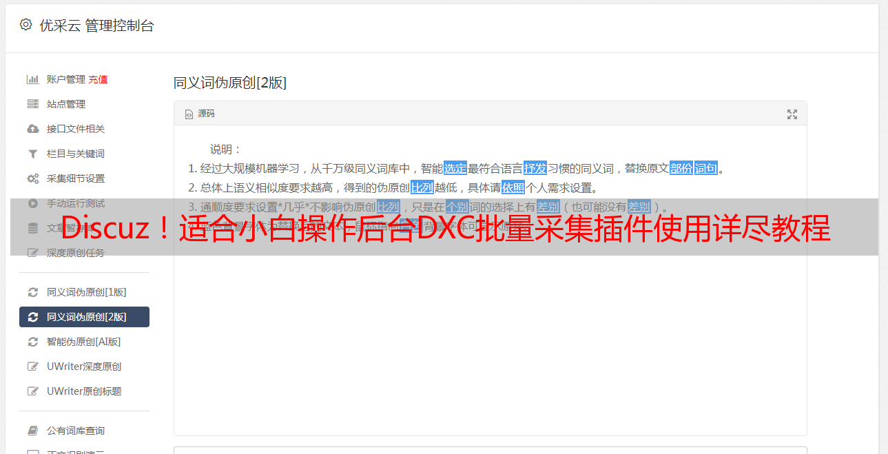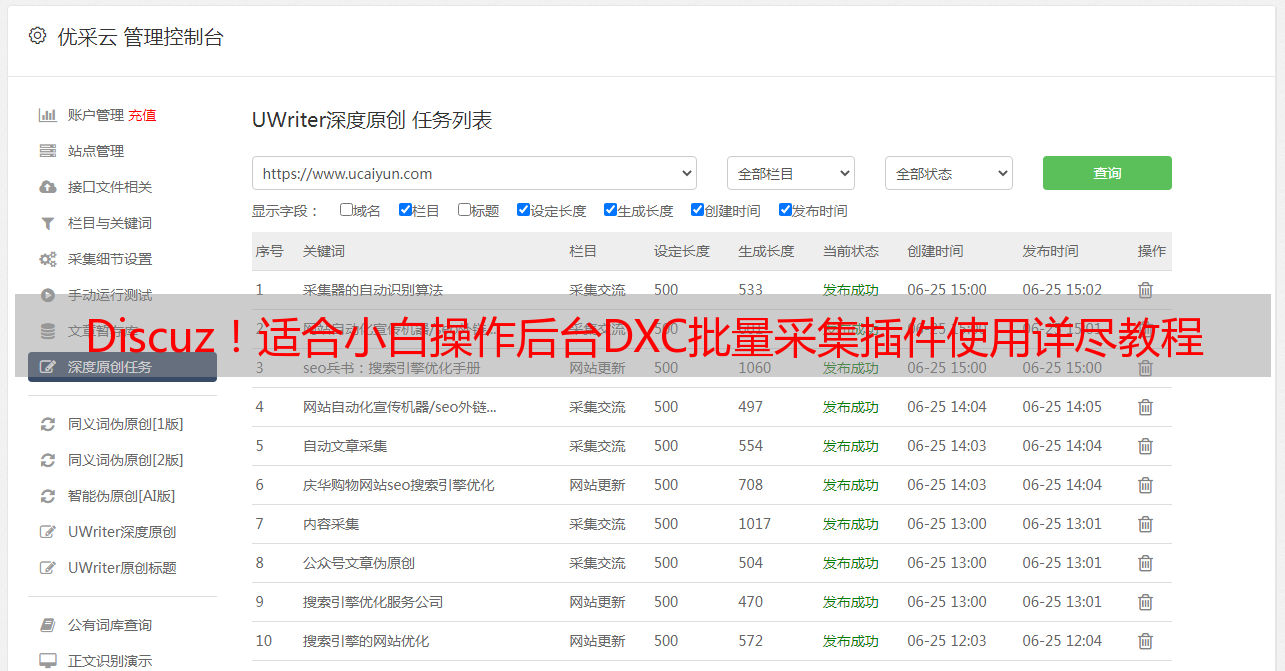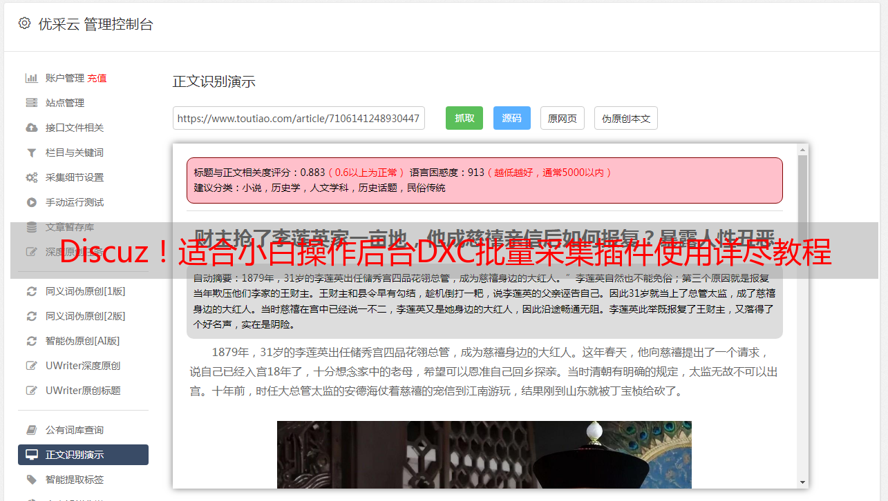 优采云 发布时间: 2020-08-22 11:51Discuz!适合小白操作后台DXC批量采集插件使用详尽教程