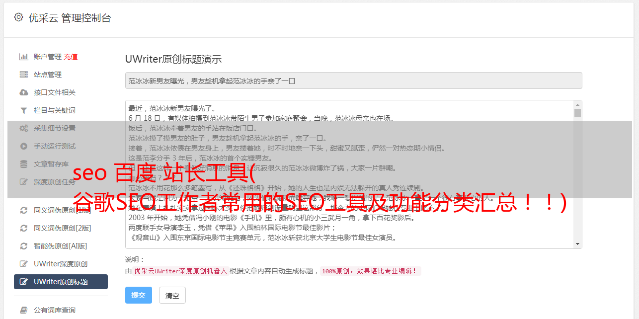 优采云 发布时间: 2021-09-11 22:11seo 百度 站长工具(
