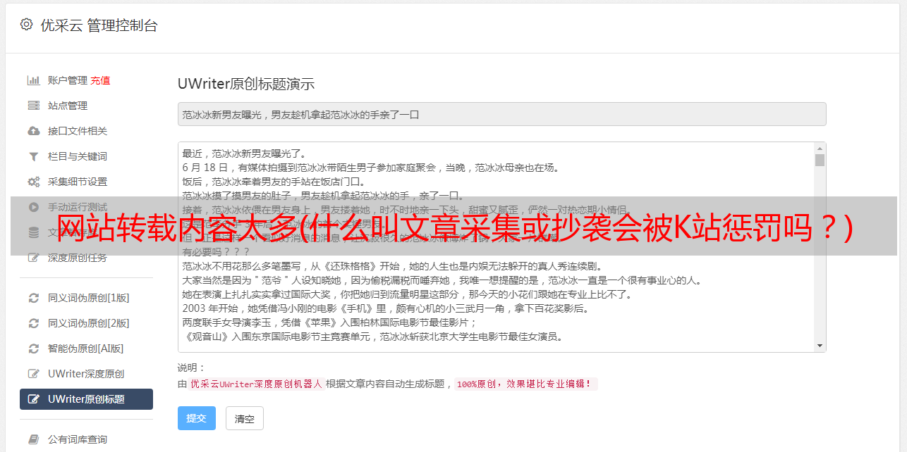 优采云 发布时间: 2021-09-13 10:15网站转载内容太多(什么叫文章采集或抄袭会被K站惩罚吗?)