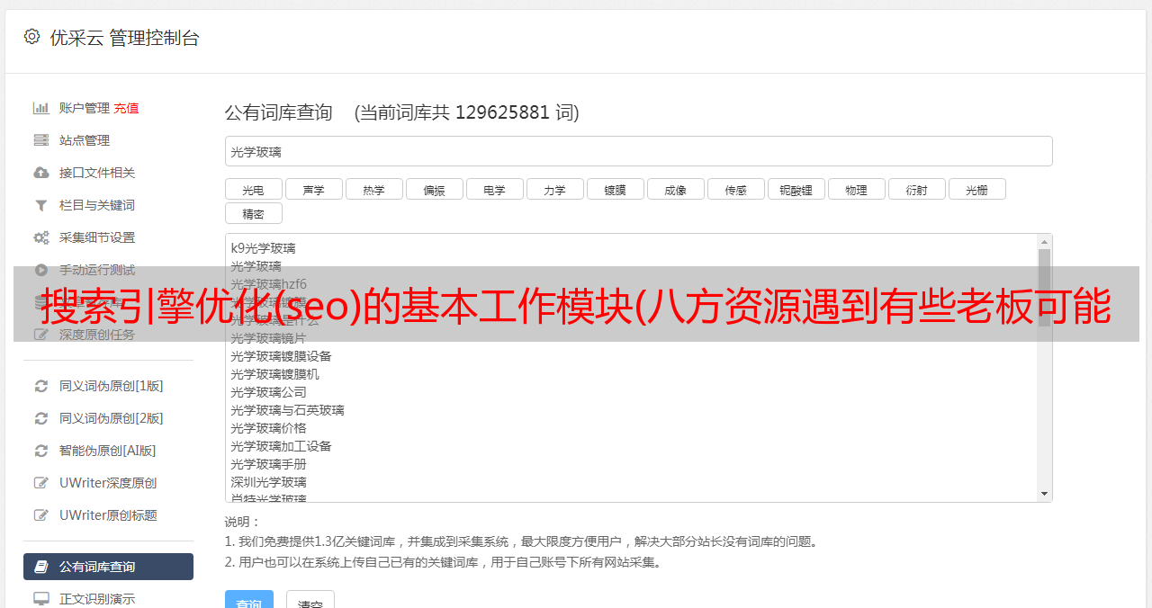 优采云 发布时间: 2021-09-14 04:10搜索引擎优化(seo)的基本工作模块(八方资源遇到有些老板可能会遇到以下几个问题)