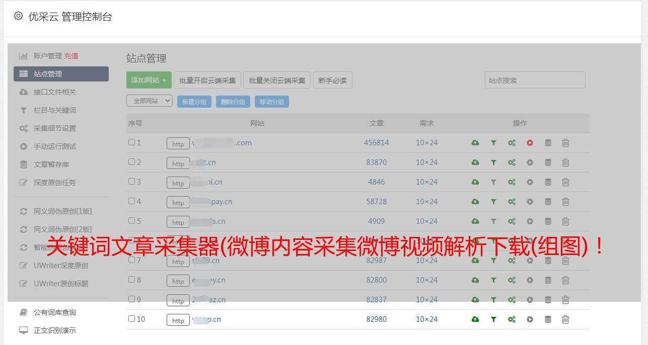 ①。可自定义过滤(匹配关键词,不包括关键词,时间范围)采集自发微博,到采集的信息可以批量下载删除