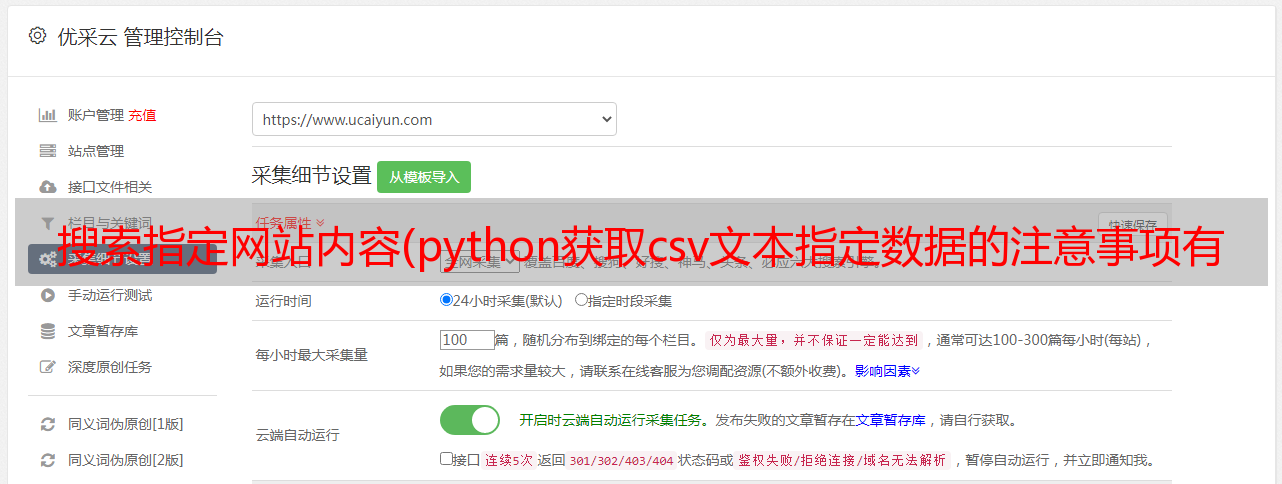 优采云 发布时间: 2021-09-19 04:19搜索指定网站内容(python获取csv文本指定数据的注意事项有哪些实战案例)