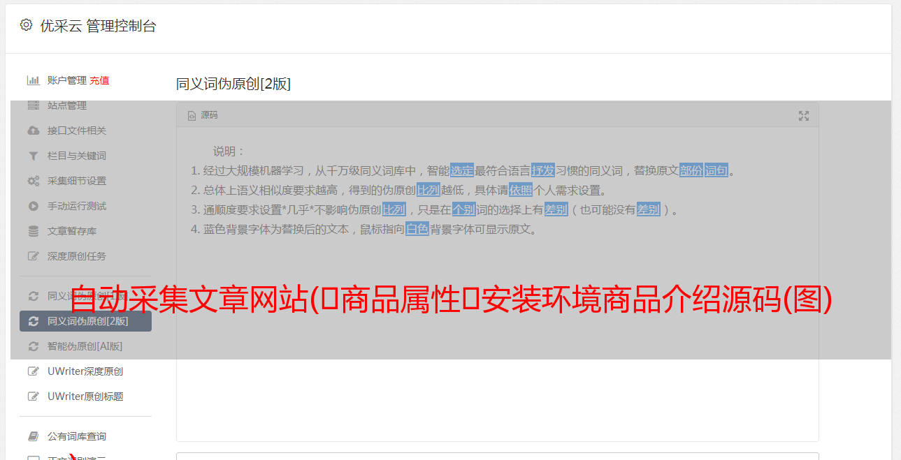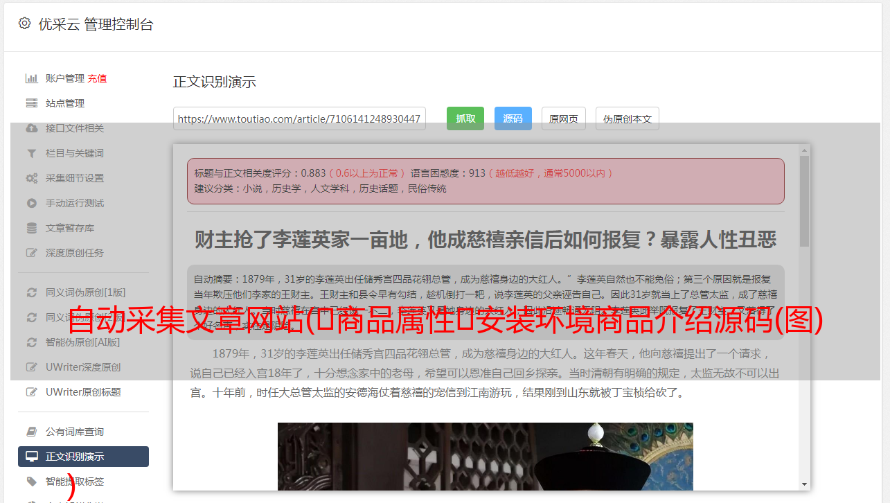 优采云 发布时间: 2021-09-21 07:15自动采集文章网站(商品属性安装环境商品介绍源码(图)