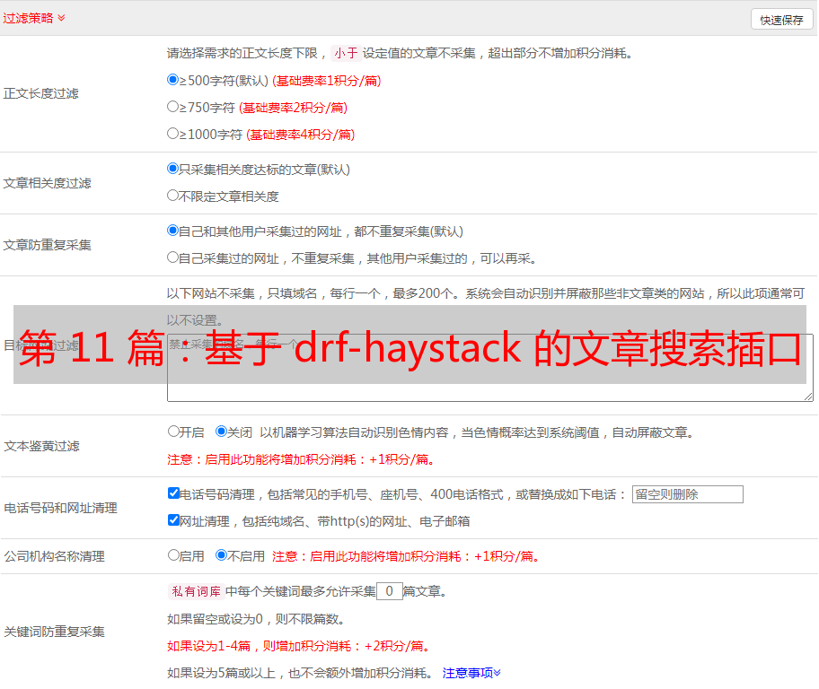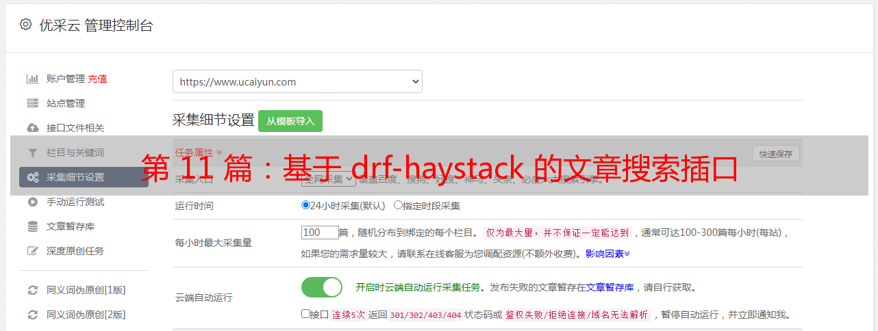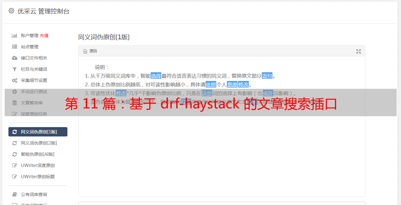 优采云 发布时间: 2020-08-26 00:20第 11 篇:基于 drf-haystack 的文章搜索插口