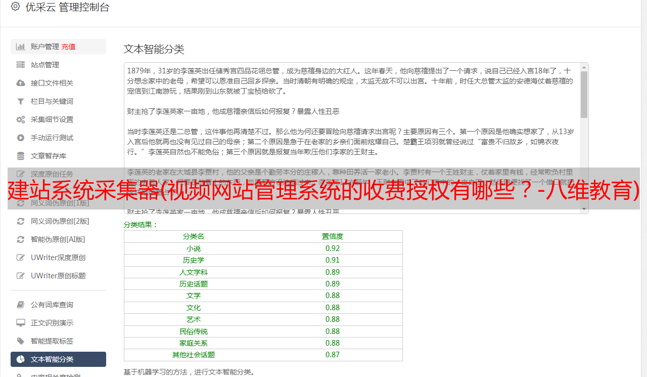 优采云 发布时间: 2021-09-23 09:21建站系统采集器(视频网站管理系统的收费授权有哪些?-八维教育)