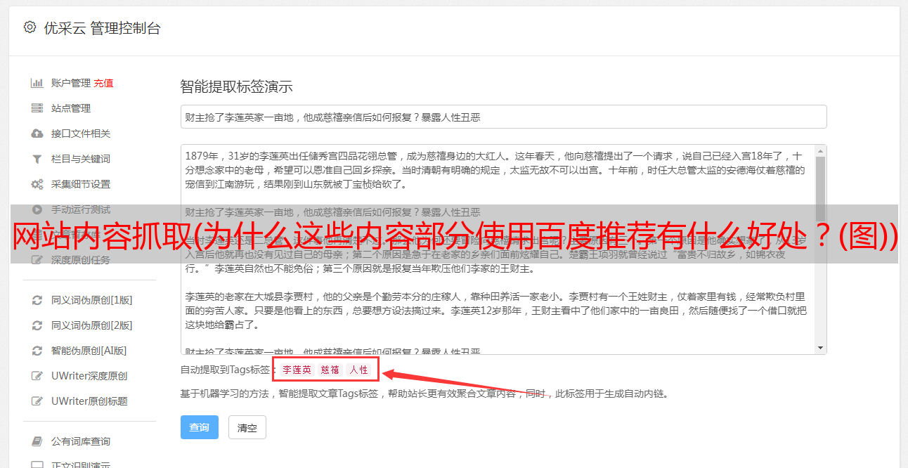优采云 发布时间: 2021-09-23 19:19网站内容抓取(为什么这些内容部分使用百度推荐有什么好处?(图))