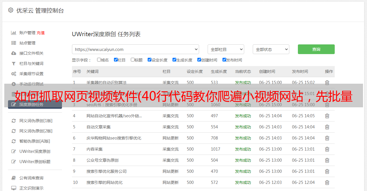 4、 返回的结果收录视频标题、网页url、guid(相当于每个视频的logo,方便后续跟进)等信息,如下图所示。