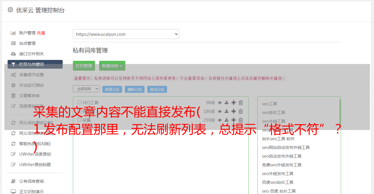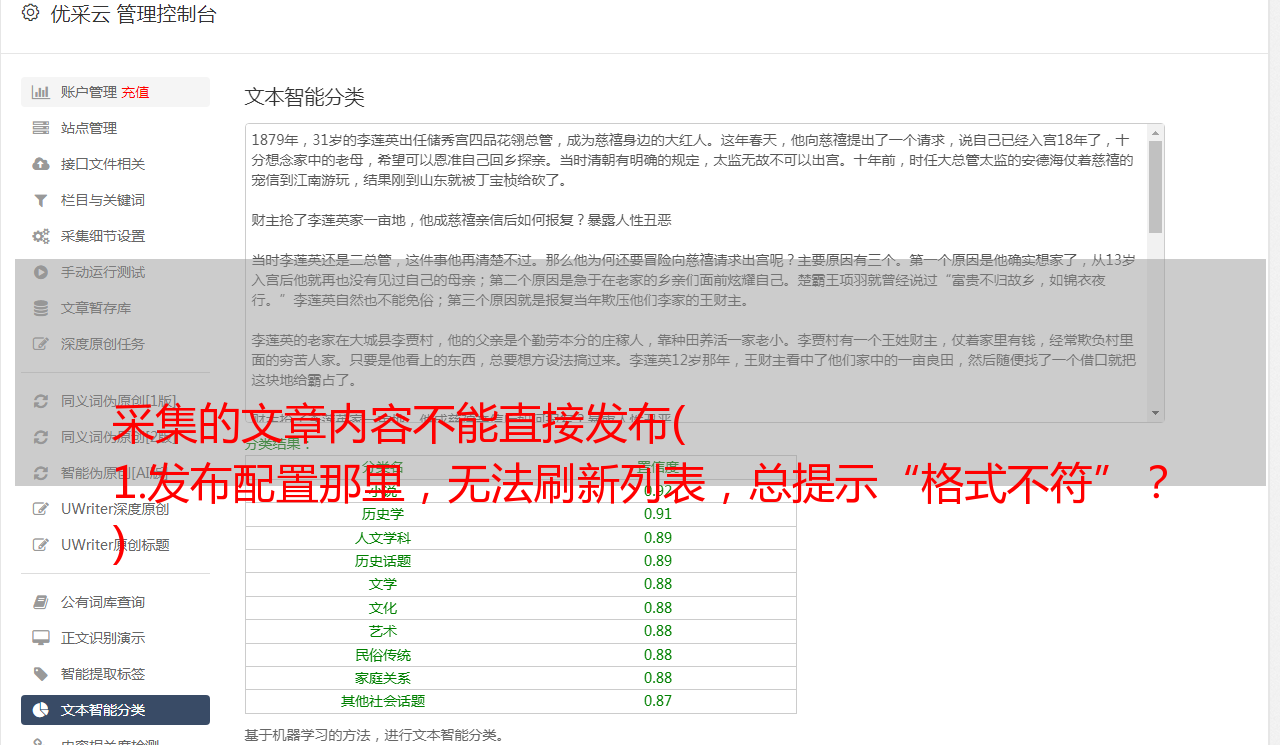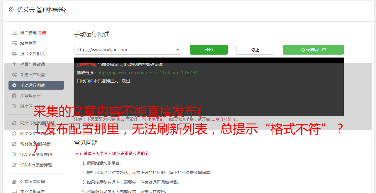 采集的文章内容不能直接发布( 1.发布配置那里,无法刷新列表,总提示“格式不符”? )