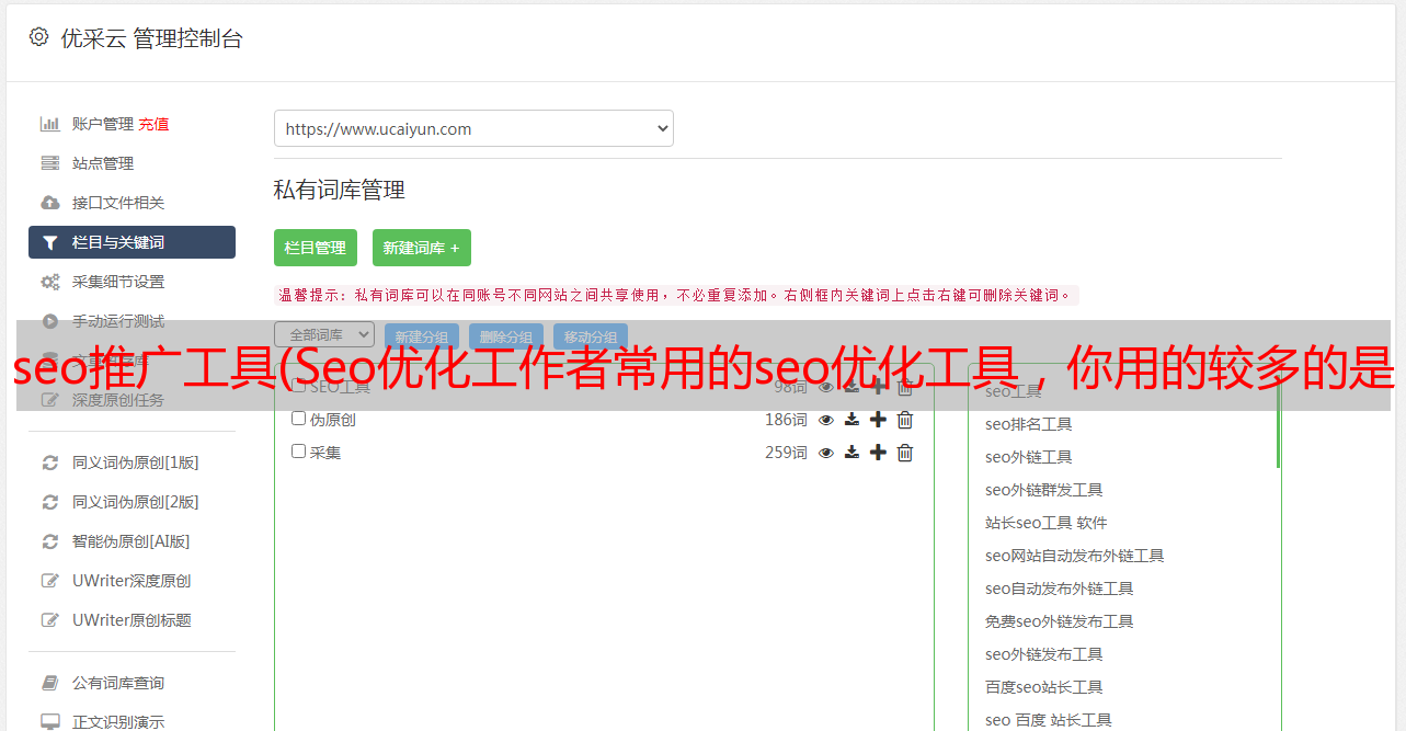 Thesaurus是一个搜索引擎优化关键词工具,专门做关键词分析网站。分为长尾词库、竞价词库、热门关键词库、行业关键词库和在线库,还可以预测热门关键词。百度推广工具有关键词planner,也属于SEO关键词工具,可以用来扩展关键词,关键词planner也可以每天查询关键词@ >搜索和比赛强度等。