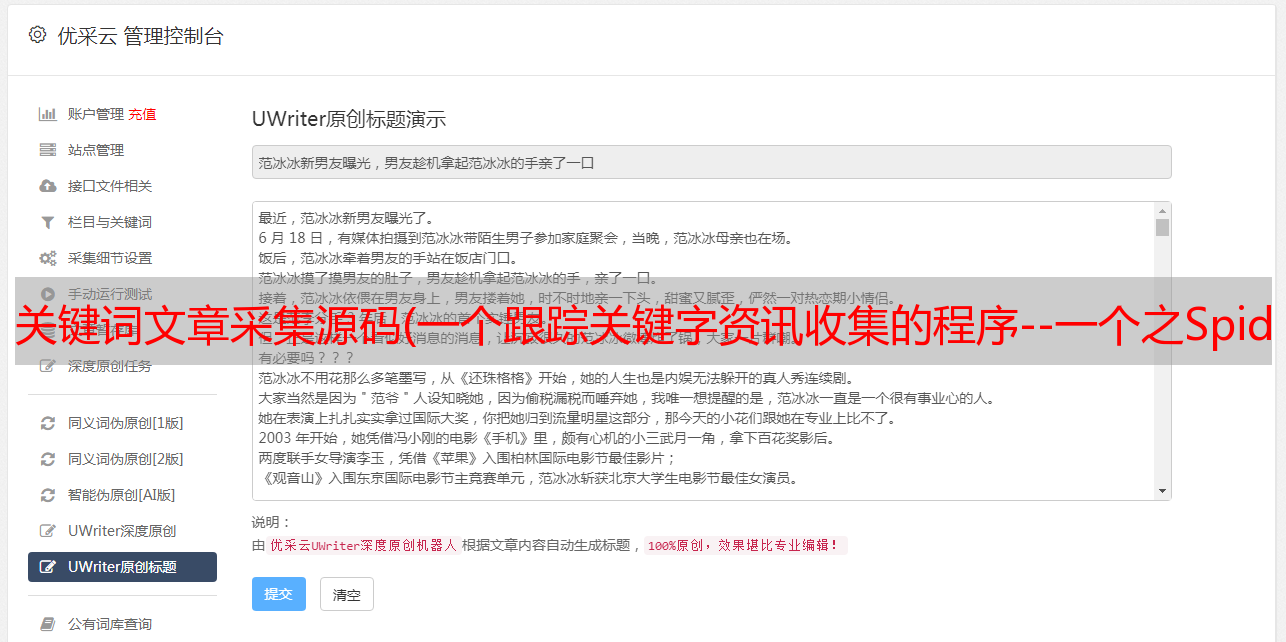 优采云 发布时间: 2021-09-27 10:16关键词文章采集源码(一个跟踪关键字资讯收集的程序--一个之Spider)