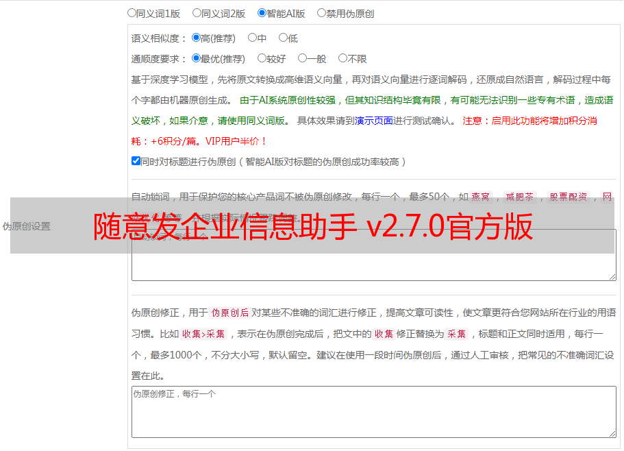 7、内含众多智能功能如:一键采集关键字、一键采集图片、自动生成标题、自动生成内容、各项指定词随机智能筛选插入等等