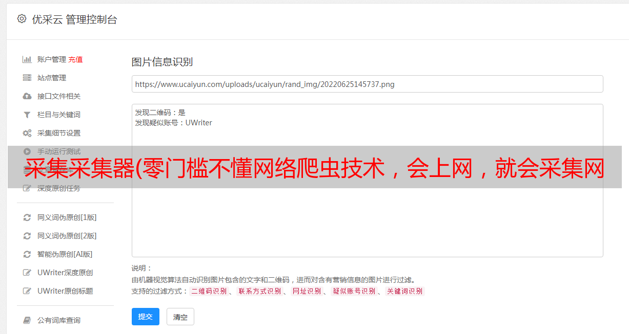 优采云采集器破解版是新一代视觉智能采集器。本软件具有零门槛、多引擎、*敏*感*词*的特点。本软件让不懂网络爬虫技术的人轻松采集网络信息,适用于99%的网站,还能智能避免获取重复数据。该软件使用方便,用户只需将相应内容放入软件中即可获取信息采集,欢迎有需要的朋友下载。