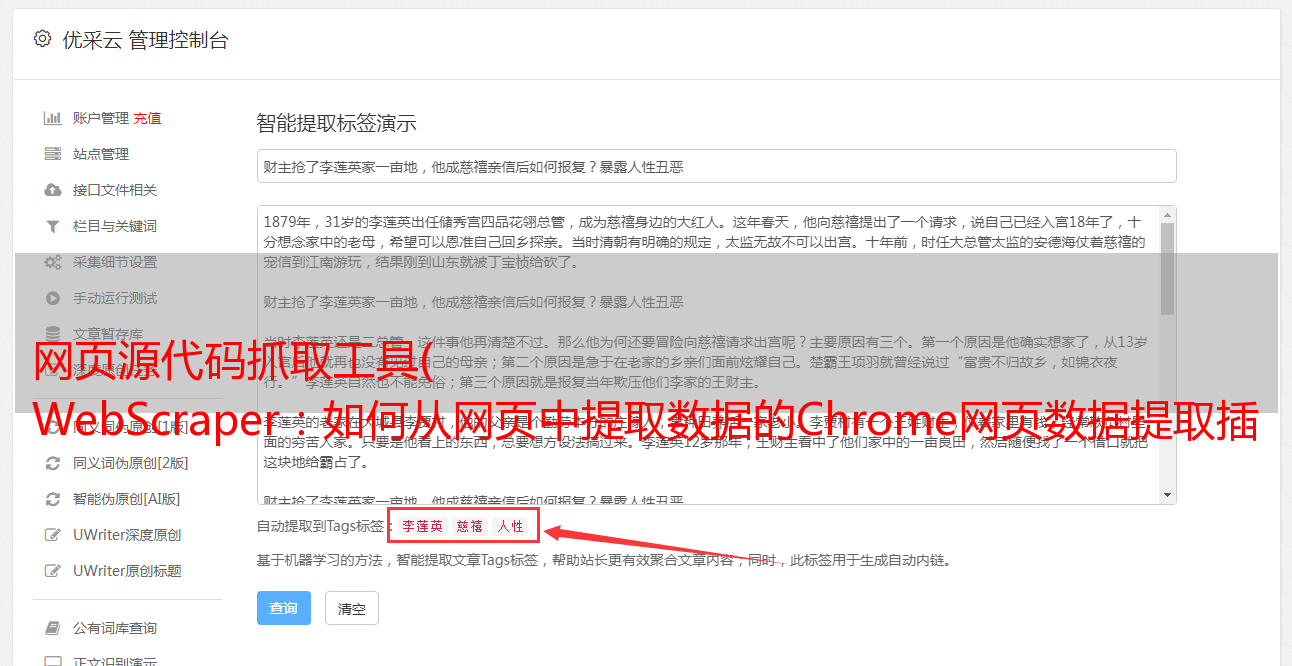 简单的说,Web Scraper是一个基于Chrome的网页元素解析器,可以通过可视化的点击操作,实现自定义区域的数据/元素提取。同时,它还提供了定时自动提取功能,使用该功能可以作为一个简单的爬虫工具。