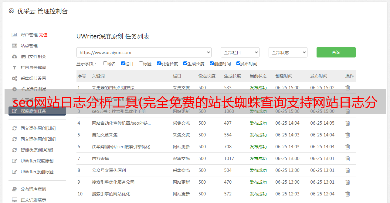 优采云 发布时间: 2021-10-07 17:28seo网站日志分析工具(完全免费的站长蜘蛛查询支持网站日志分析支持对网站内容进行分析)