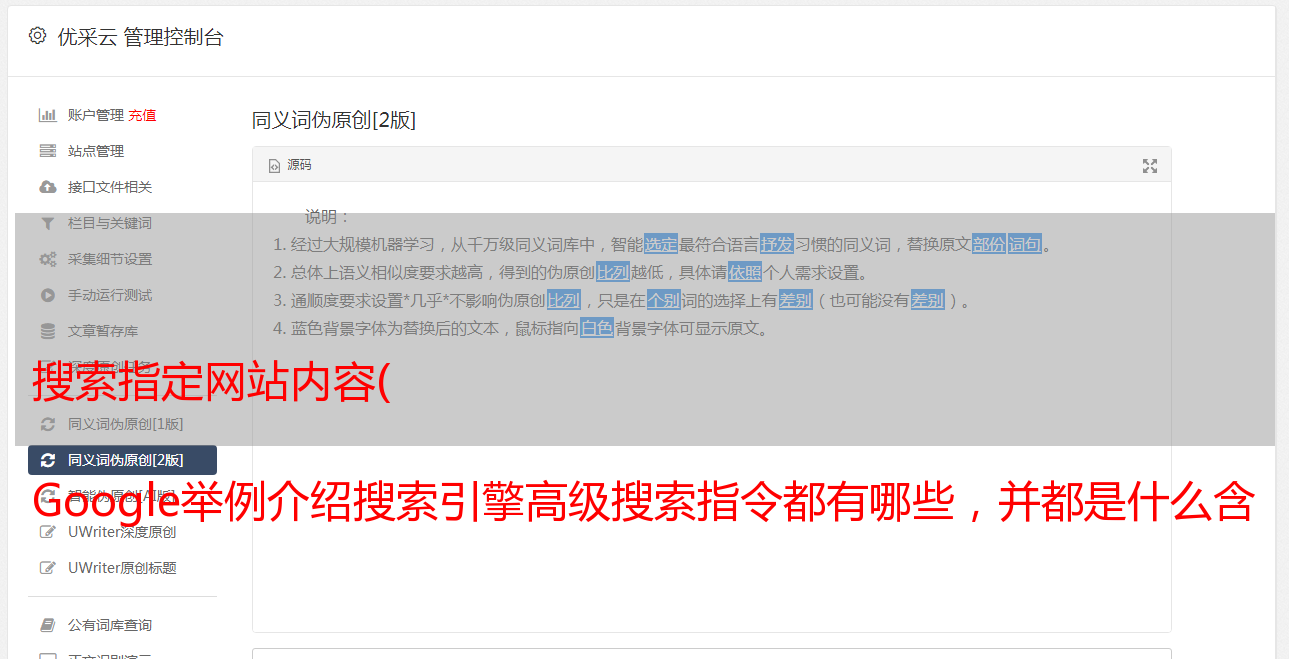 站点:将搜索结果限制在某个域名或目录中,例如:网站优化站点:意思是:搜索针对网站优化的收录网站的相关页面。如果不加关键词,一般返回的是网站收录的总数,也可以搜索某网站某列收录@ > 多少文章,如:site:/info/ 返回URL目录下的所有内容,目录限制只支持谷歌。