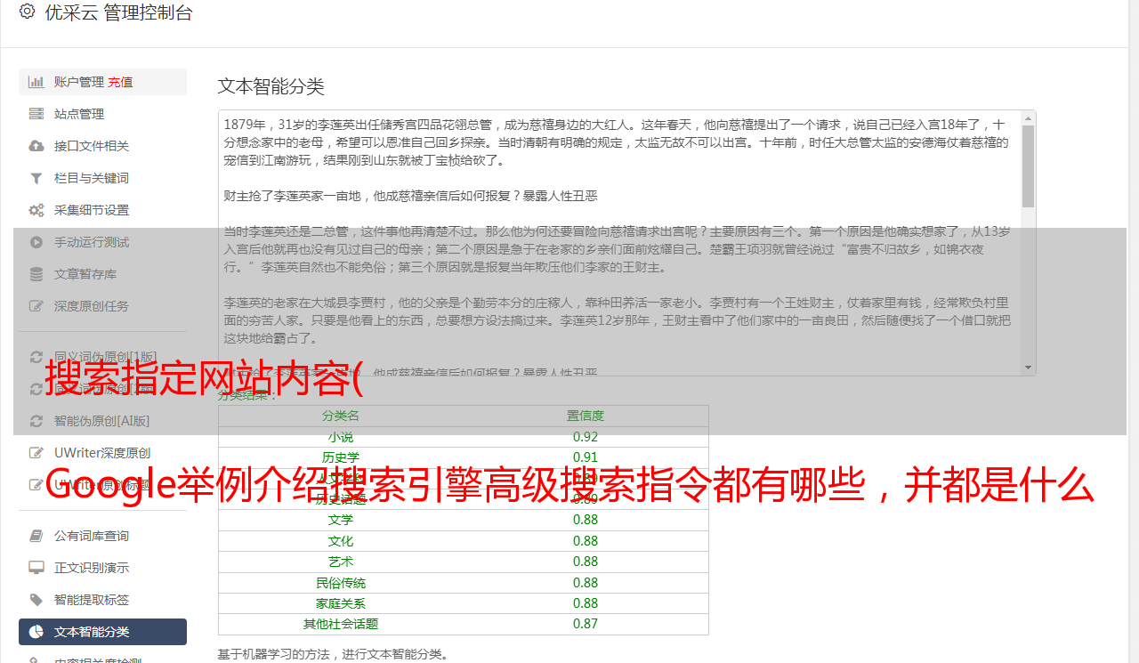 以上搜索命令大部分在使用时可以混用,同一个搜索可以使用多个高级搜索命令,如:intitle:Zhengzhou网站Optimization-site:使用四个搜索命令,intitle和双引号标记,减号,站点,表示搜索标题收录郑州网站优化的所有页面,该站点被排除在搜索结果之外。