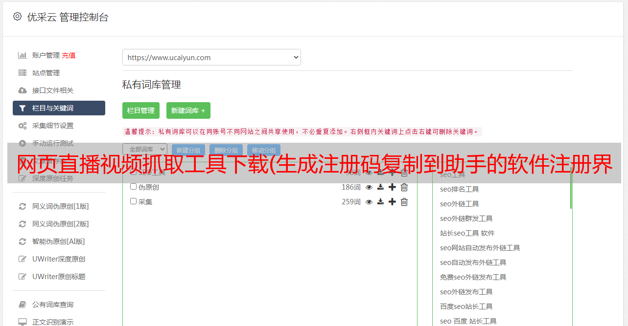 优采云 发布时间: 2021-10-09 03:00网页直播视频抓取工具下载(生成注册码复制到助手的软件注册界面点击注册重启软件)