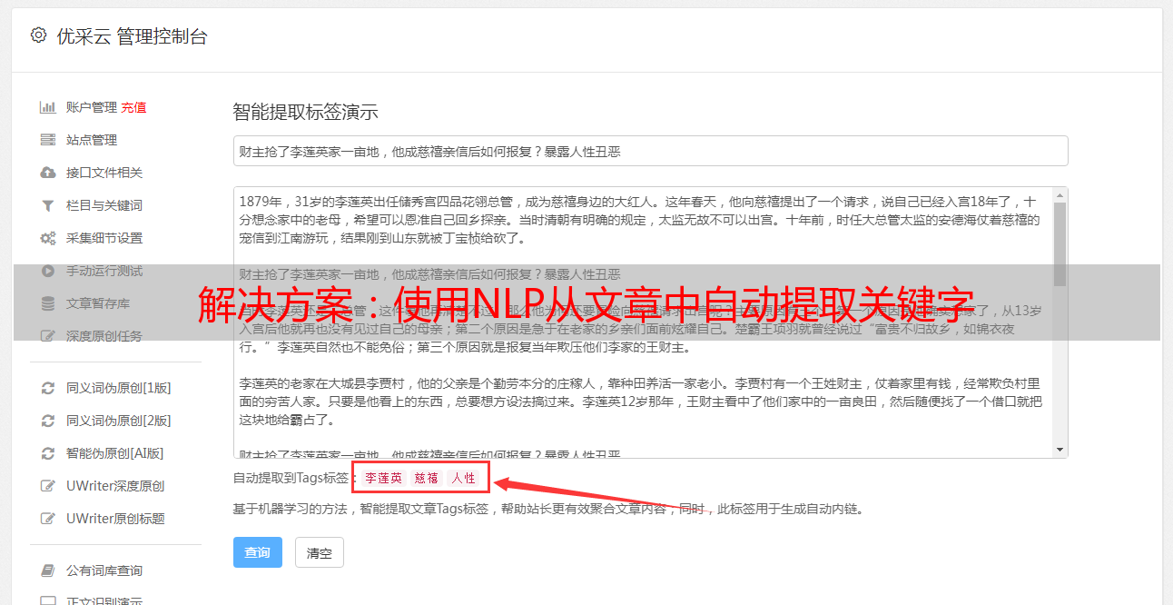 提取关键字的常规方法包括根据文章的内容和作者的判断手动分配关键字,但这需要大量的时间和精力,并且在选择合适的关键字时可能不准确. 随着NLP的发展,关键字提取变得更加有效和准确.