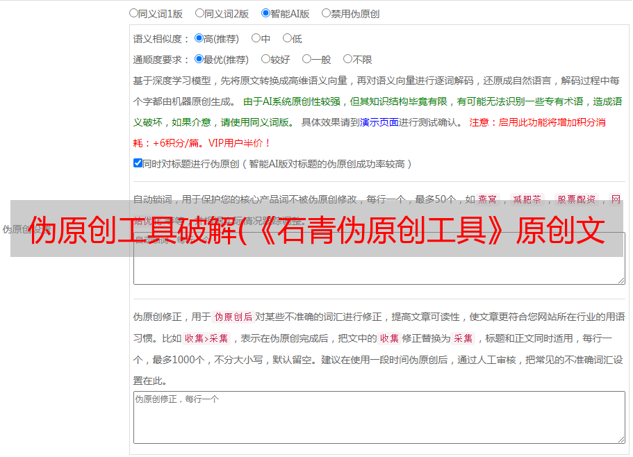 1、伪原创该工具全球首创:本地和网络2种不同的伪原创方法;
