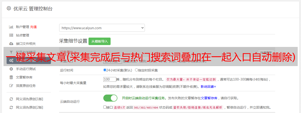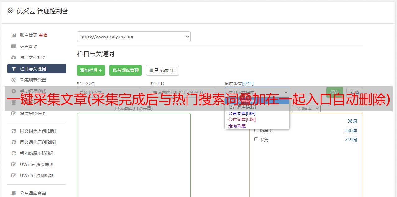 一键采集文章(采集完成后与热门搜索词叠加在一起入口自动删除)