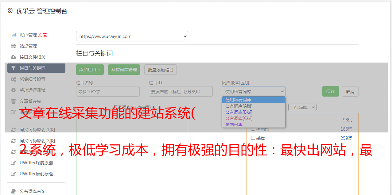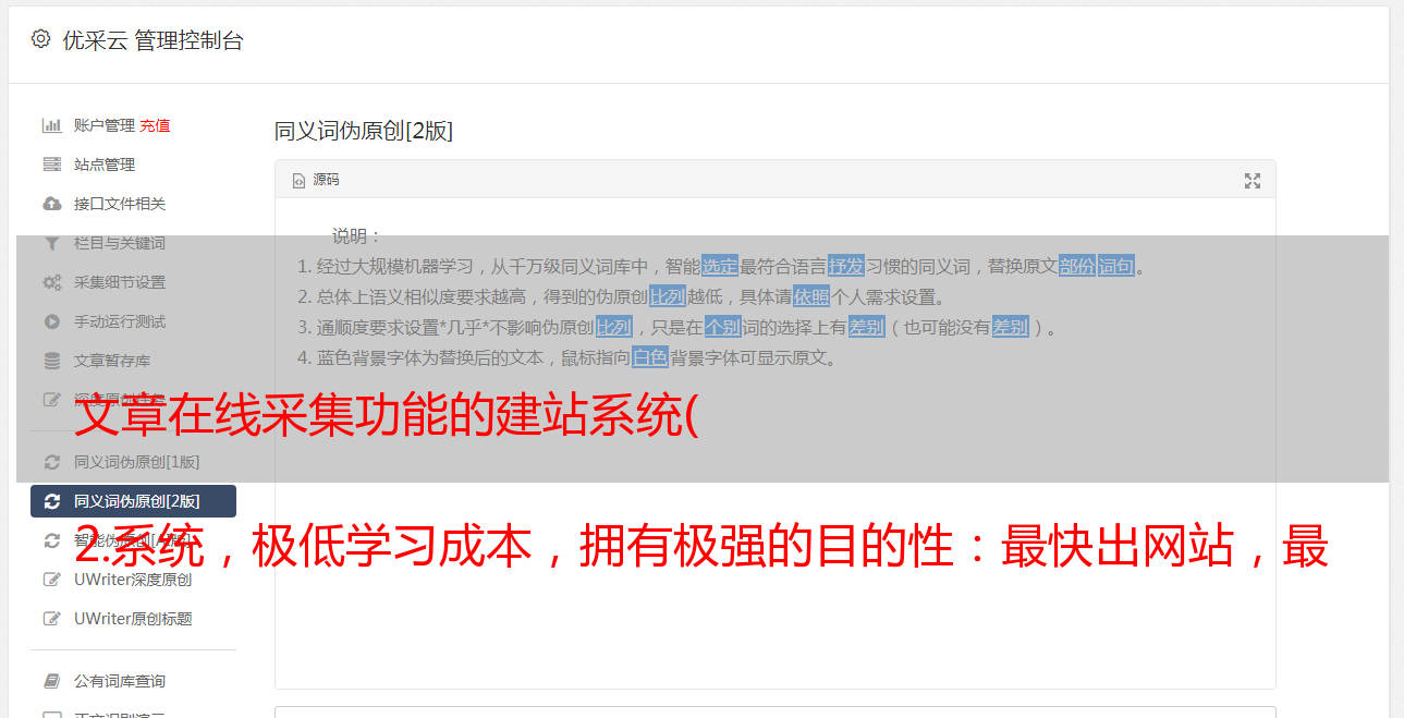 文章在线采集功能的建站系统( 2.系统,极低学习成本,拥有极强的目的性:最快出网站,最快赚到钱!)