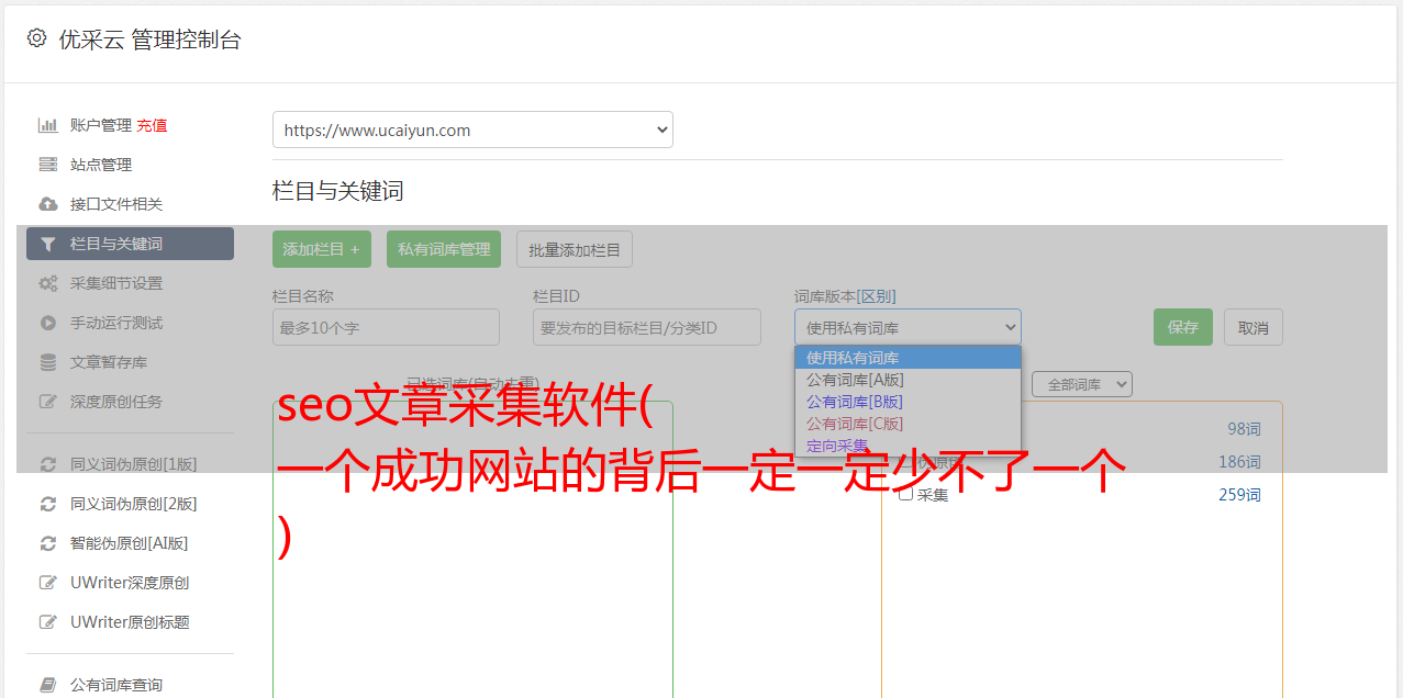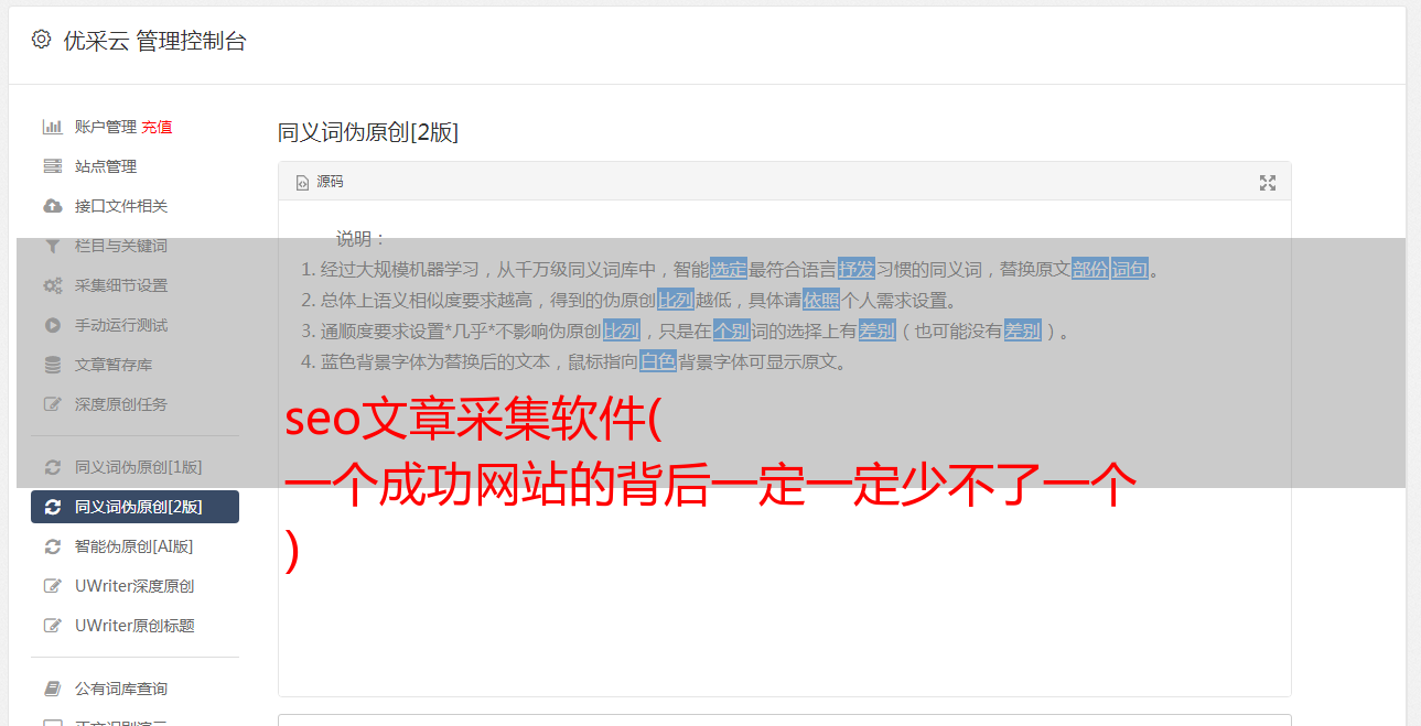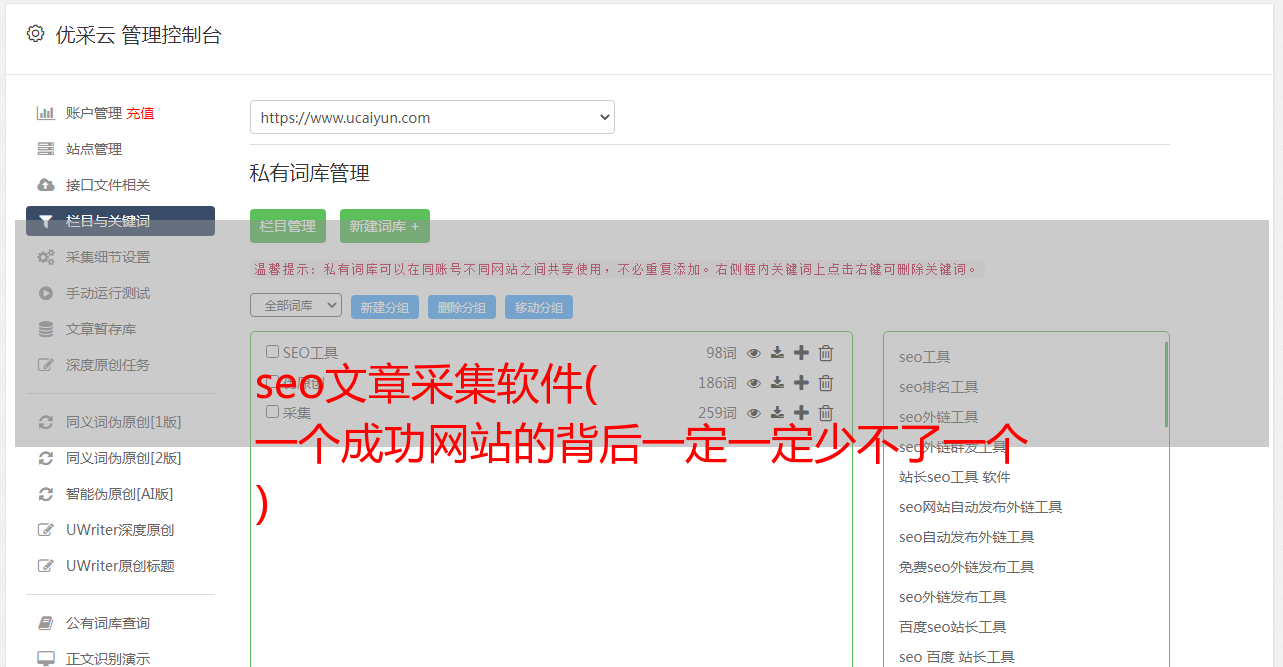 这里小编为大家推荐一个一站式工具网站文章采集、原创、群发-优采云采集、优采云采集目前支持数十种主流cms建站系统,可快速解决网站文章搜索、原创、发布等需求.、有效提升网站收录、排名、权重,直接将SEO效率翻倍。